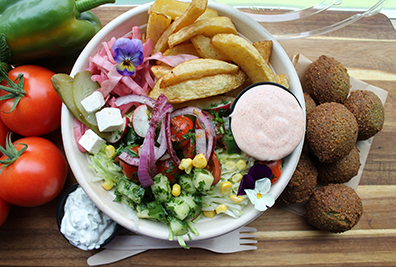 Bowl m. frisklavet falafel, med ris / bulgur / pastasalat / valgfri fritter, frisk tomatsalat, et drys feta, citron, oregano.