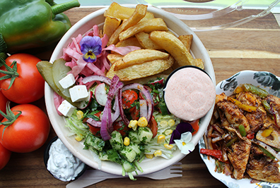 Bowl m. marineret kyllinge fajita, med ris / bulgur / pastasalat / valgfri fritter, frisk tomatsalat, et drys feta, citron, oregano.