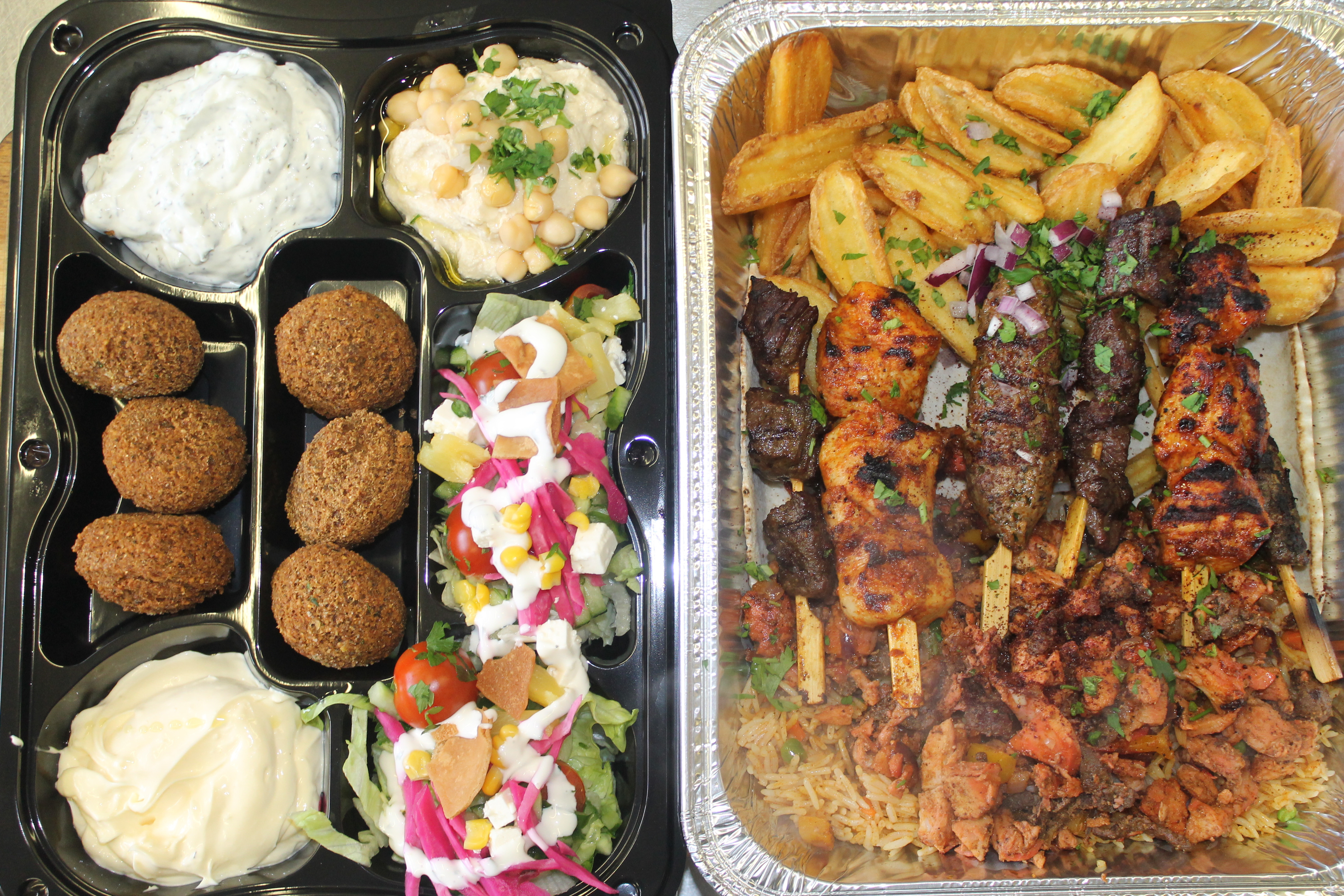 Tapas Bowl Med Ris / Valgfri Fritter, Shawarma, Fajita, 6stk falafel, 1stk Oksespyd, 1stk Kyllingspyd, 1stk Koftaspyd, Humus, Tzatziki, Fladbrød, Frisk Tomatsalat, Hvidløgsmayo, Et Drys Feta, Citron, Oregano.
