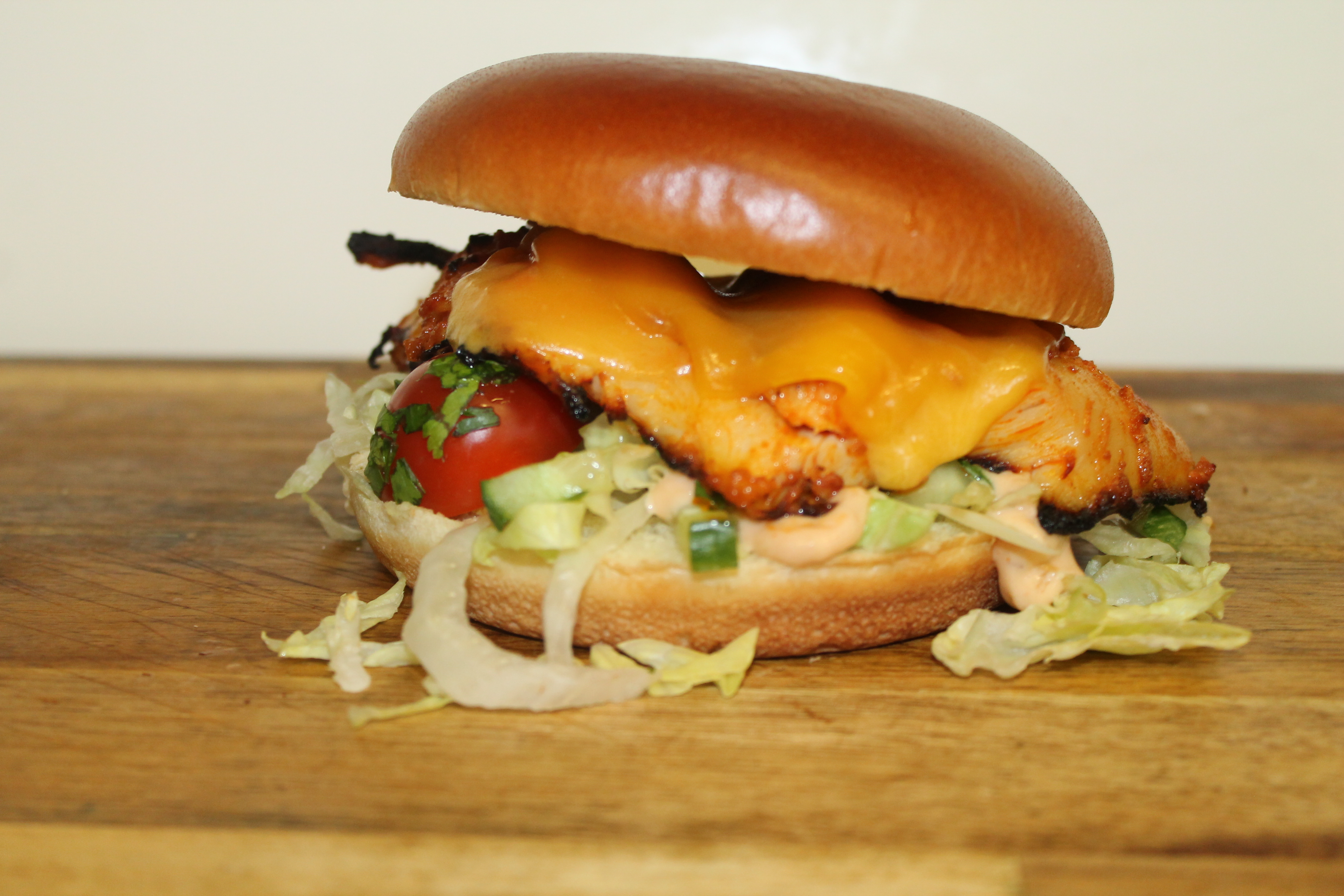 Deluxe kyllingeburger m. fajita, salat, cheddar, mayo, frisk tomatsalat og burgerdressing.