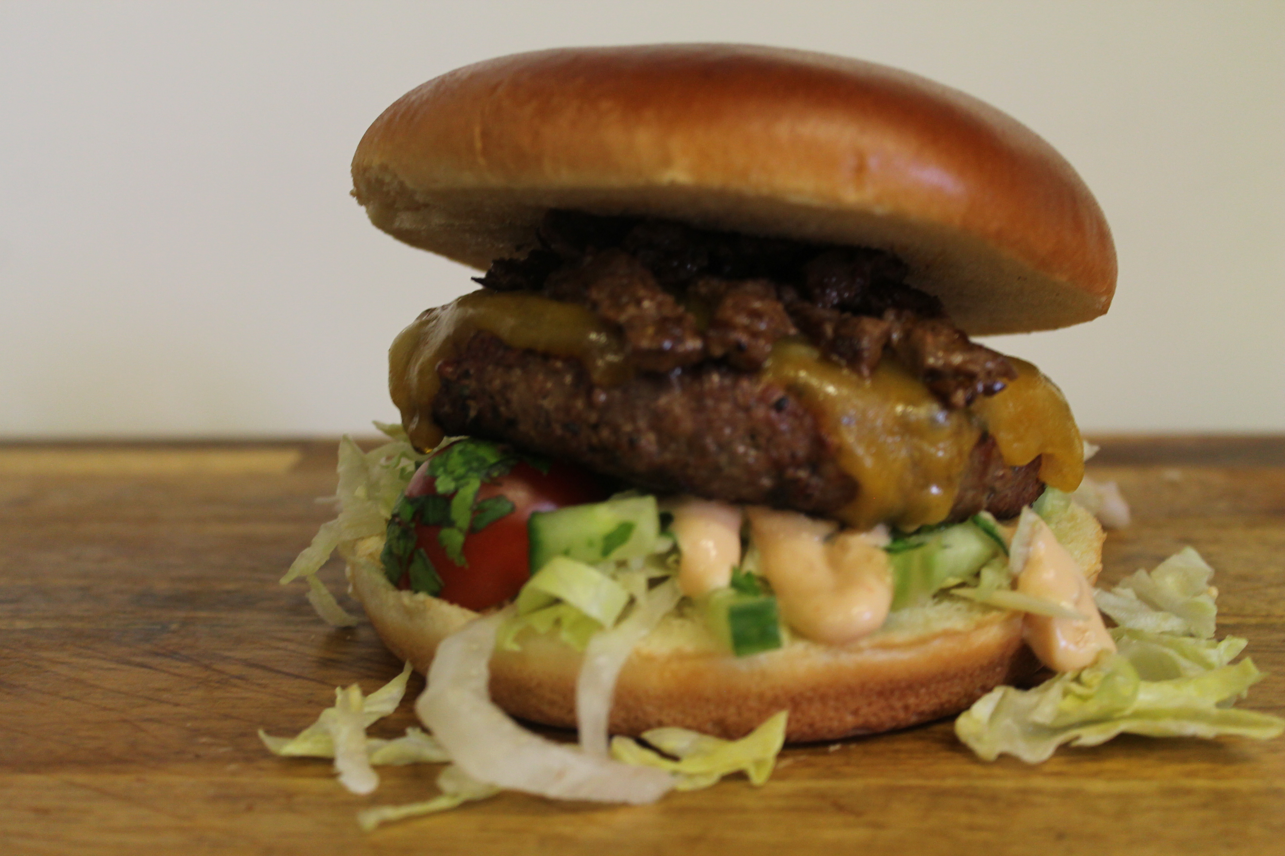 Deluxe oksekødsburger m. shawarma, salat, cheddar, mayo, frisk tomatsalat og burgerdressing.