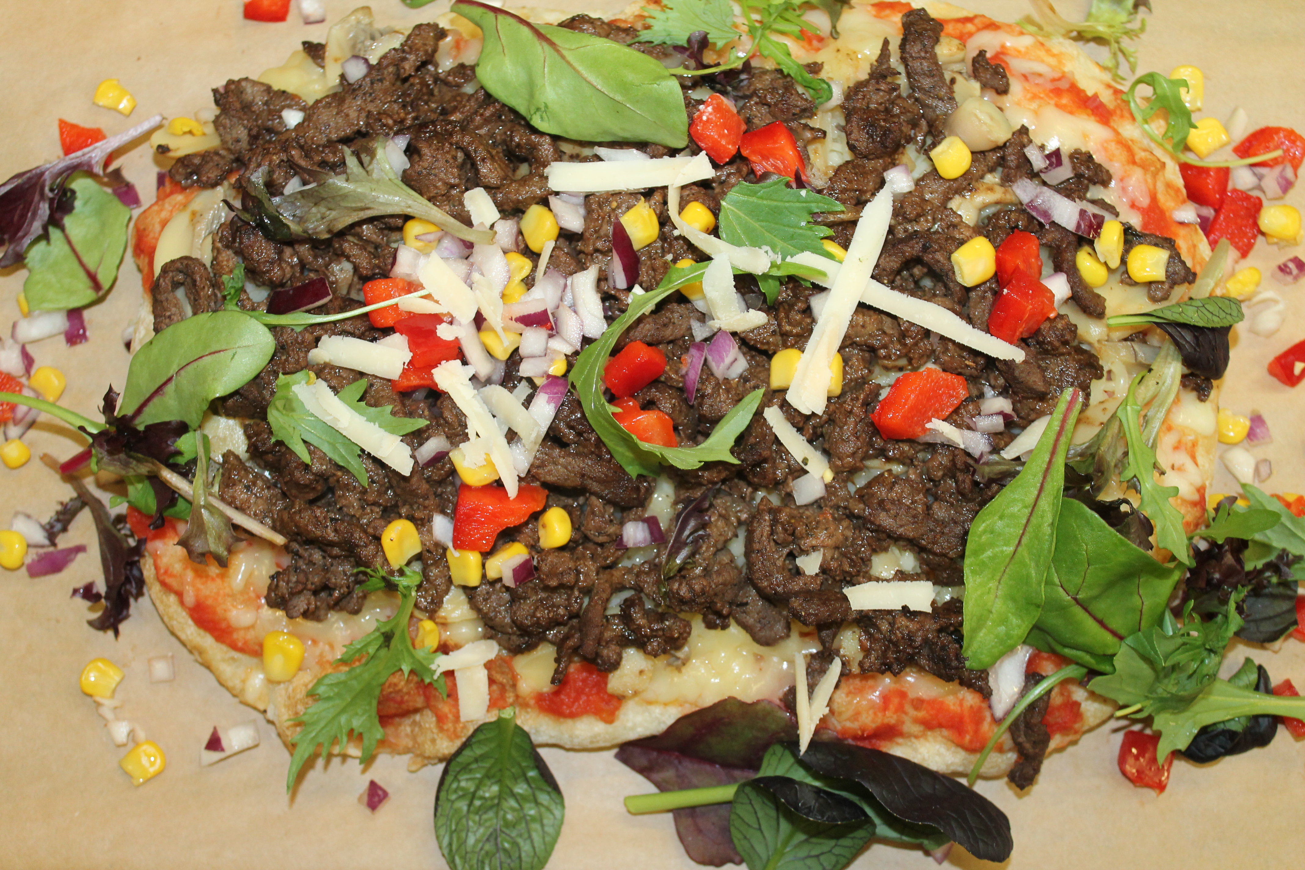 Scrocchiarella m. oksekøds steak, svampe, majs, peber, frisk rødløg, frisk rucolasalat, parmesanost, sumak, tomatpesto, ost og oregano.